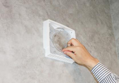 熱交換素子やダクト内部の汚染物質の室内への拡散・還元のおそれのある第1種(熱交換型)の換気システムや全館空調は使用せず、メンテナンス性と省エネルギー効率の高い北欧スウェーデン製の第3種(集中排気型)換気システムを採用しています。