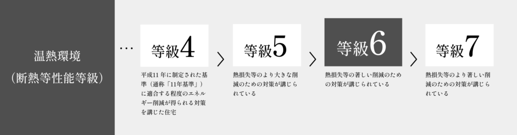 最新の住宅性能表示制度の性能表示項目「5-1 温熱環境(省エネルギー対策等級)」において、ウェルダンの住宅は最高等級である等級6を標準で取得できます。この表示項目は、暖房器具に使用するエネルギーの削減のための断熱化等による対策の程度を表示するものです。