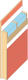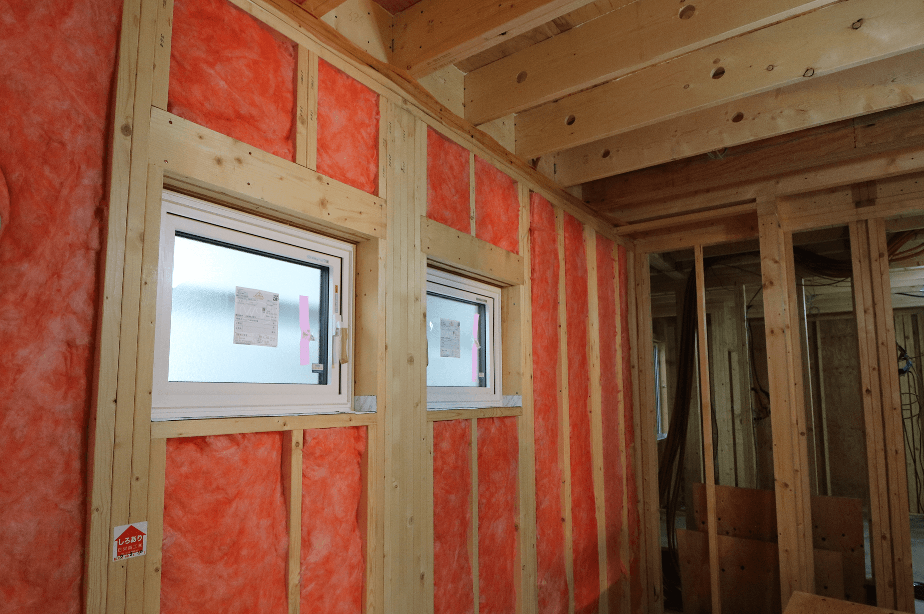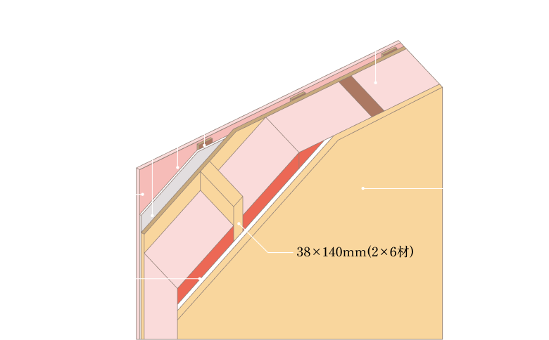 ウェルダンでは2×6(ツーバイシックス)工法の場合でグラスウール(24kg/㎡相当、熱伝導率λ=0.038W/m・K)を厚さ140㎜も充填しています。