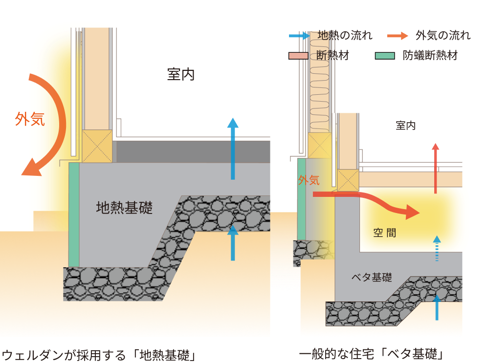 基礎断熱の一種であるウェルダンの「地熱基礎」は、床下を全面土で埋め尽くし、その上をコンクリートで仕上げる工法です。 地熱基礎は、床下がなく地熱をダイレクトに利用できるため、床下に断熱材は不要です。