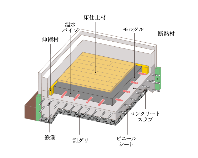 蓄熱式温水床暖房「ウェルダン」は、蓄熱体であるモルタルの上に直接フローリングやタイルの床仕上げをするため、