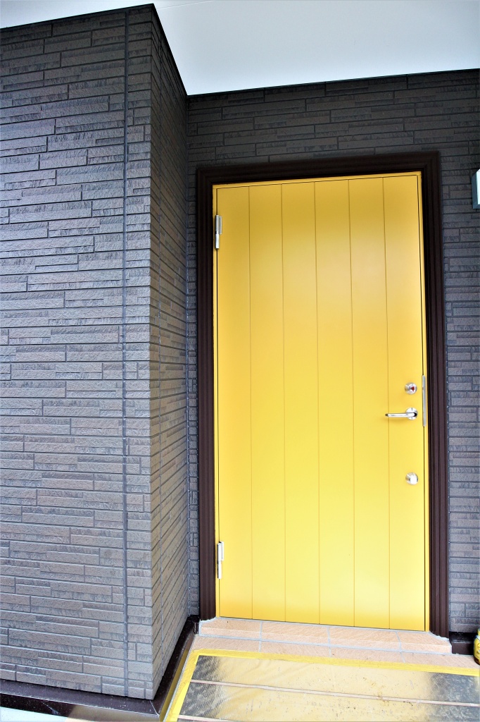 玄関ドアは断熱性に優れているスウェーデンドアのイエロー色を採用しました。