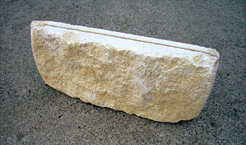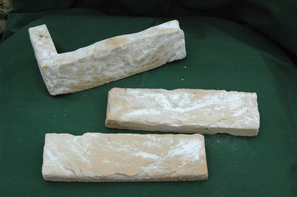 スライス加工されたレンガの上側面に溝を入れて金属レールにはめ込み、その上に目地を入れる乾式工法施工です。