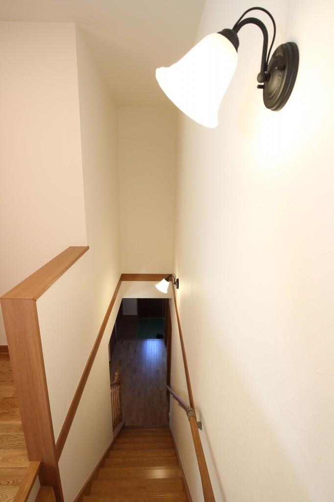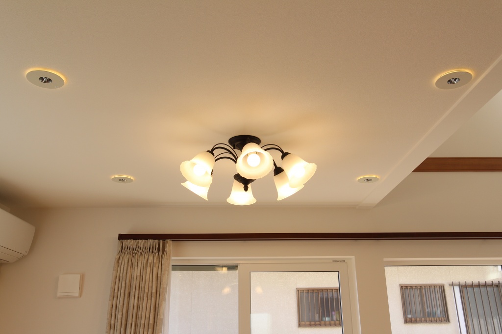 リビングの照明は吹き抜け、玄関ホール、階段と同じシリーズの照明を揃えました。