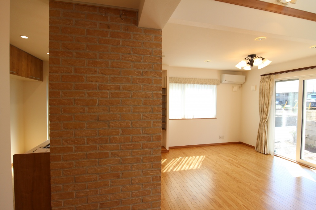1階LDとホールには一部に、外装と同じくベルギーレンガのアルバローズ色を貼りました。
