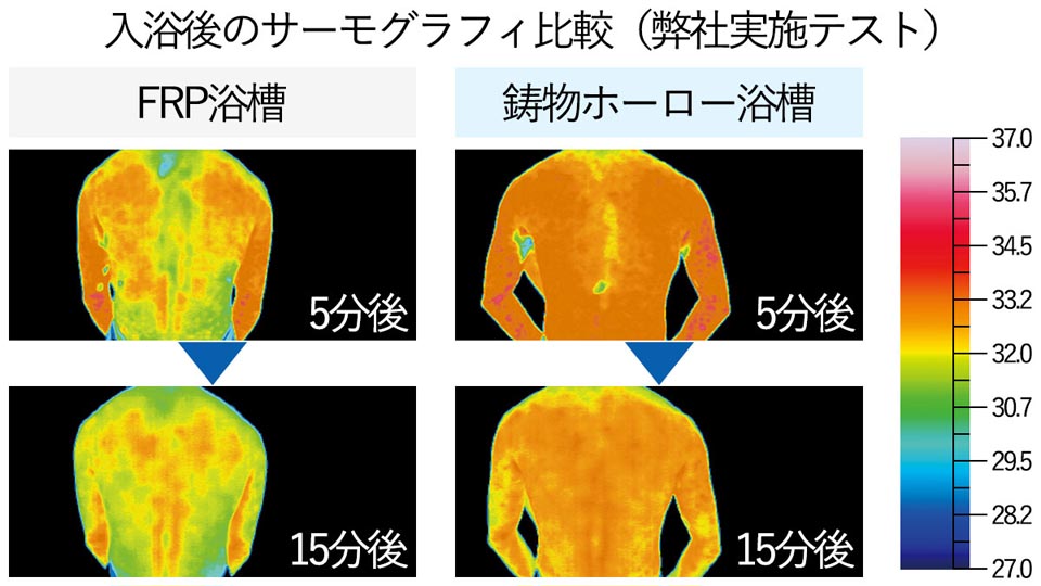 素地の鉄が熱を吸収し、保温材が閉じ込めるので浴槽自体が暖かくなります。