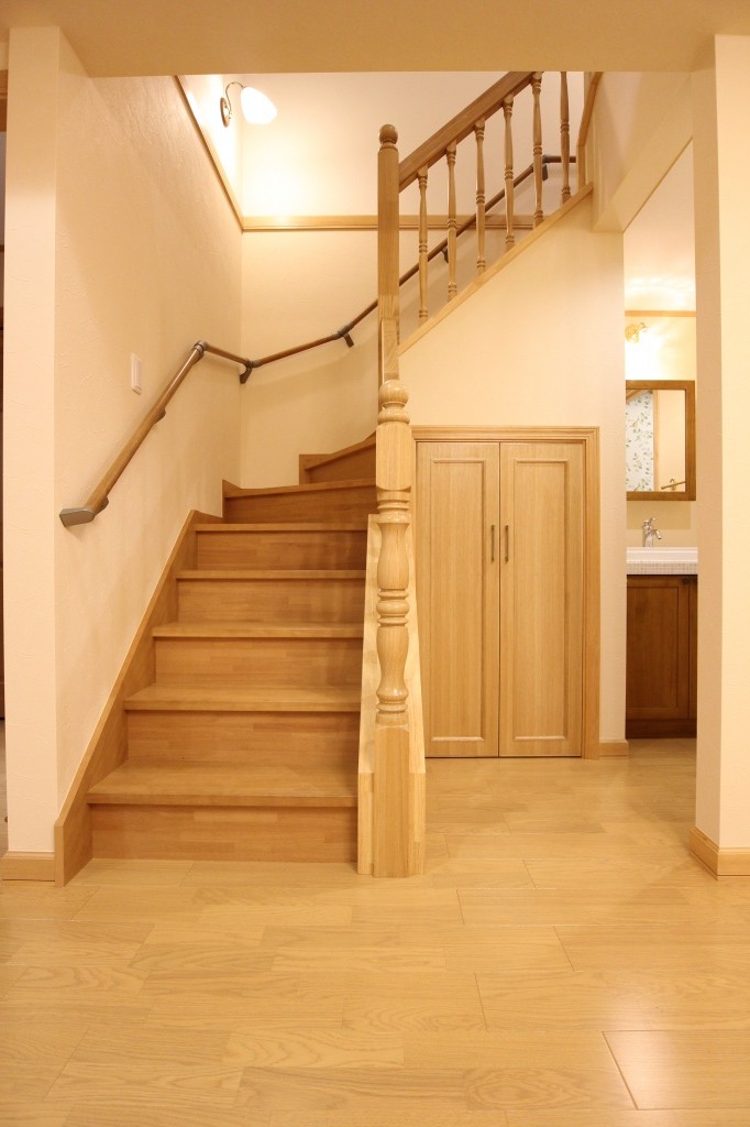 階段下には物入スペースを設け、扉の色、階段の色、手すりの色等々を木本来の色味で統一し、
