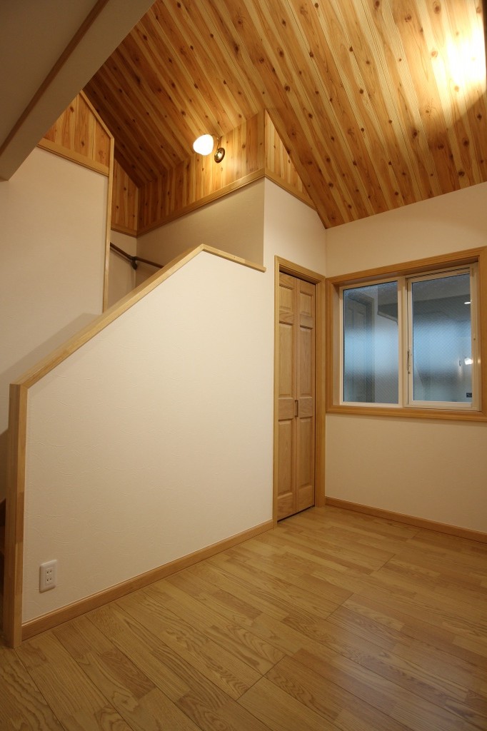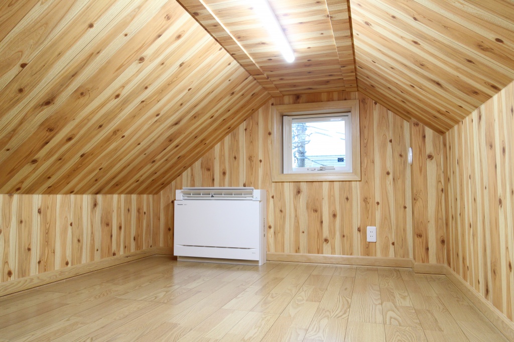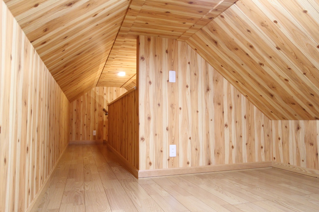 小屋裏はサンゲツの木目調のクロスを壁・天井に貼りました。