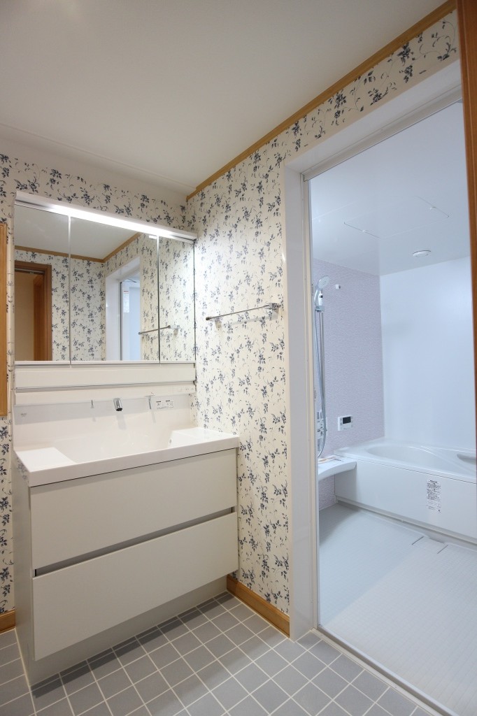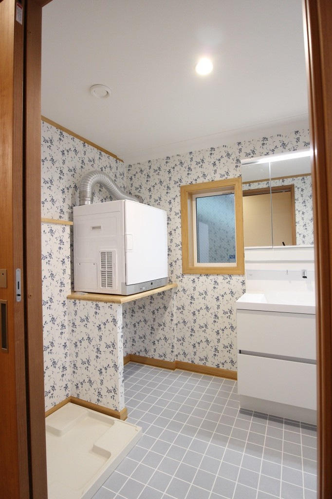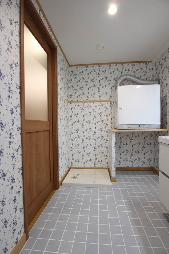 2階洗面室はLIXILのブルーのタイル材を床に貼り、クロスもリリカラ社製の白地にブルーのお花柄のクロスを採用しました。