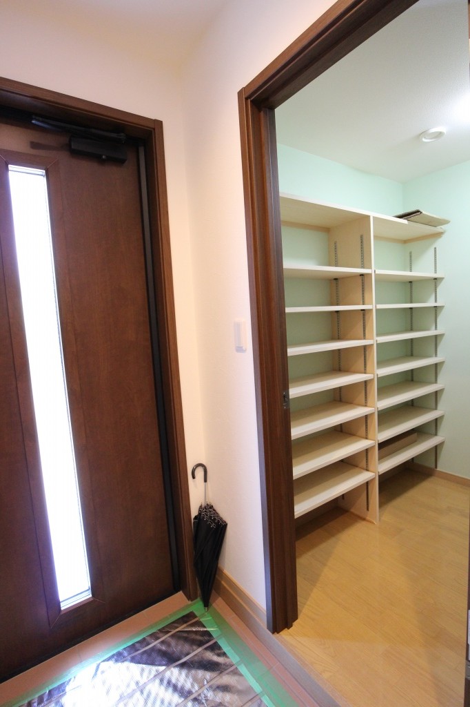 玄関から入ってお客さんから見えない位置に靴だなを設置しました。