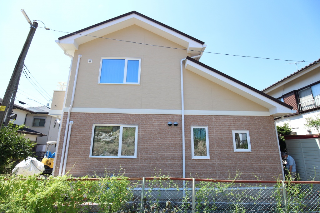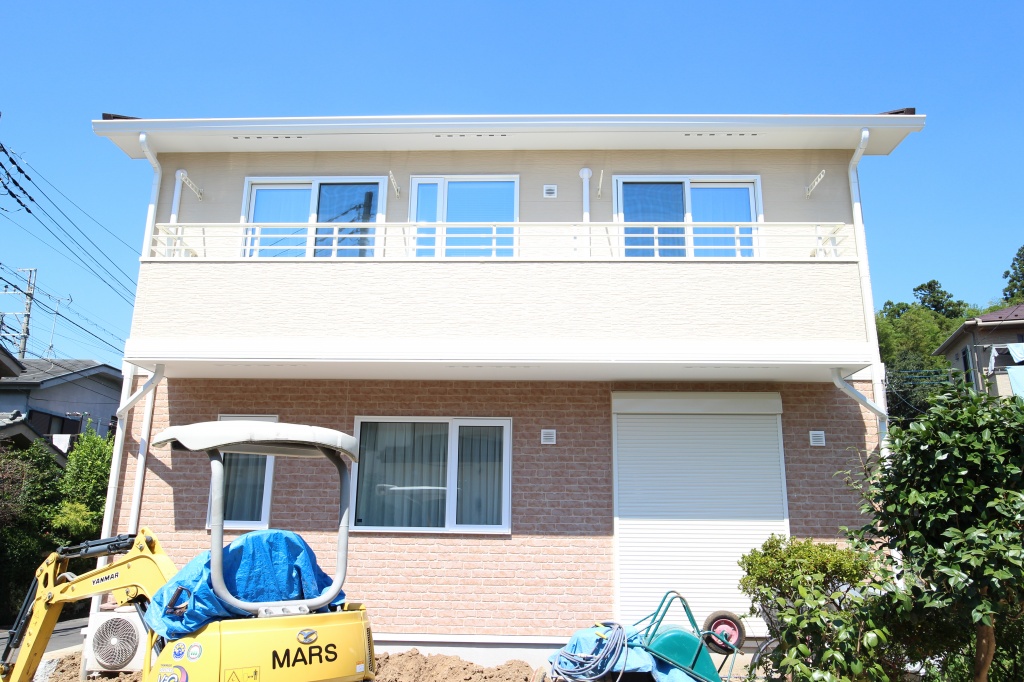 バルコニーの手すりや破風、雨樋、窓のサッシなどを全てホワイトで外壁の色と統一し、全体的にやさしく温かい雰囲気の外観となりました。