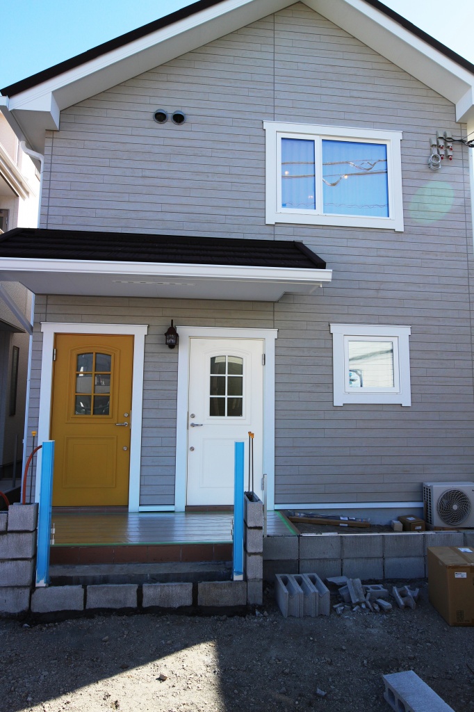 玄関が2つ並び、それぞれ玄関ドアを色違いのスウェーデンドアでまとめおしゃれなファサードとなっています。