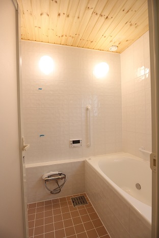 浴室が綺麗。モデルルームと同じ白色タイルとパインの浴槽天井を選びましたが、気に入っています。