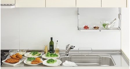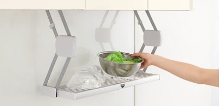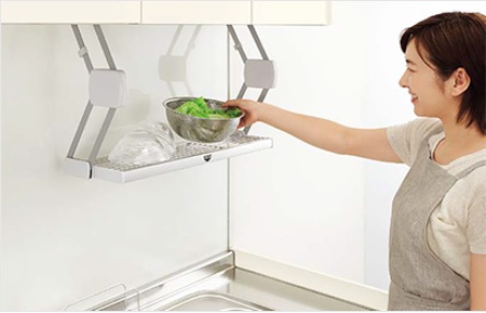 調理や盛り付けの作業スペースが足りなくなった時に、サッと下ろして仮置きできる