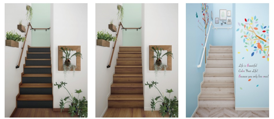 階段の色も、踏板と蹴込と側板と様々なパターンで変えられるので、