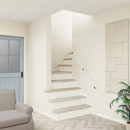 全てホワイト系にして、明るい印象に。手すりは濃いこげ茶のクリエダーク色で、
