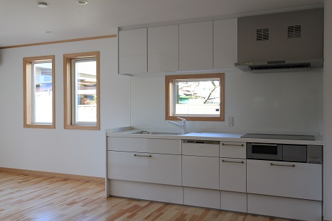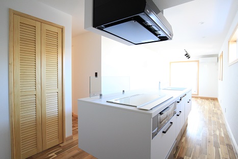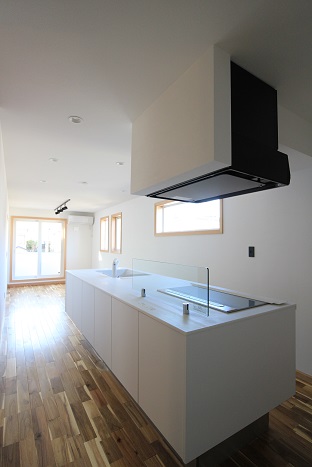 子世帯のキッチンはアイランド型で、色はどちらも鏡面のホワイトを採用致しました。