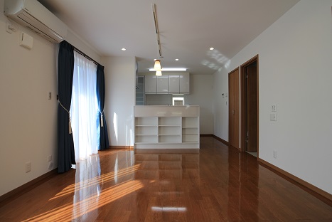 キッチンの対面、ダイニング側に収納力の高い造作棚を設け、