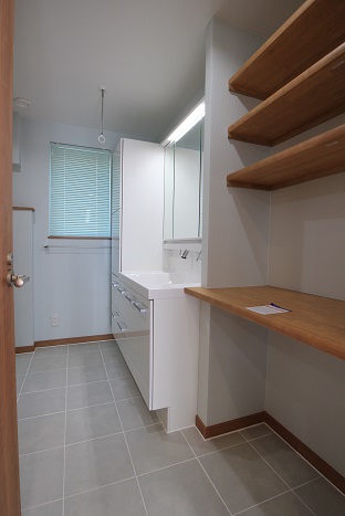 洗面所には造作棚を設けました。リネン類がたくさん収納出来て、使い勝手がいいようにしました。