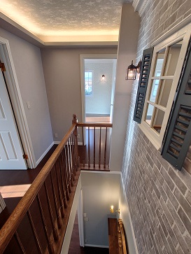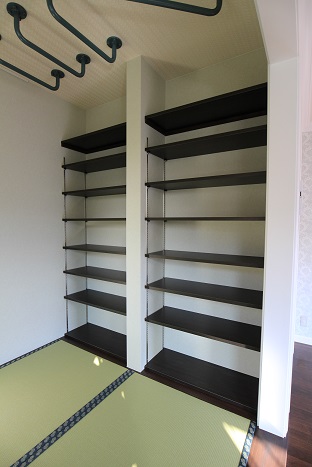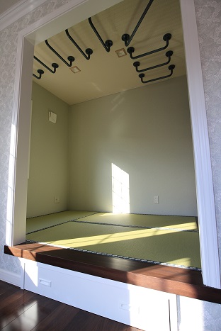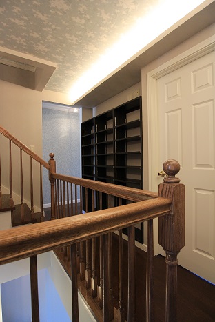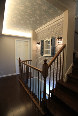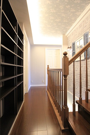 TOP スタッフブログ 横浜市青葉区の家が完成しました#2 横浜市青葉区の家が完成しました#2 リビング 小上がり和室付きリビング。 小上がり部分には引出しが付いて収納たっぷり。 和室には本棚と、天井にはお子様の運動の為の雲梯が付いています。 階段室 木製の手すりと飾り窓で、雰囲気のある素敵な階段室になりました。 壁面のアクセントクロスに、落ち着いたアースカラーの リリカラのレンガ調の壁紙を使用致しました。 色合いを合わせて、天井には日中は大人しい雲の柄。 暗くなると光って、天体の星座が浮き出てくるサンゲツの壁紙を使用致しました。 廊下の壁面には本棚を作りました。