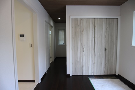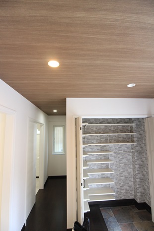 玄関には収納スペースを設け、造り付けの棚を沢山取り付けました。
