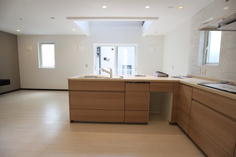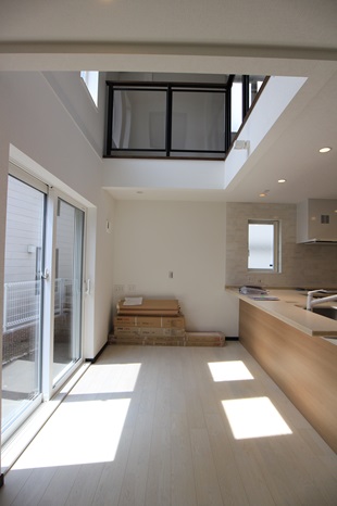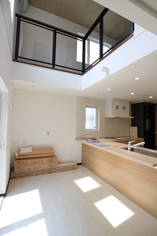 キッチンの上部を吹き抜けにすとことで、明るく柔らかな陽射しが入り込み、