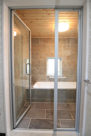 浴室の扉も透明な親子戸を用いて、窓枠をシルバーアルミにすることで、