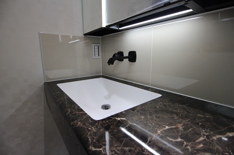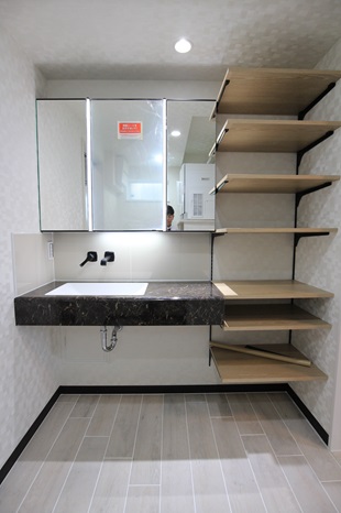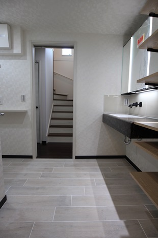洗面のタイルより色を少し濃くすることで奥行きが出ます。