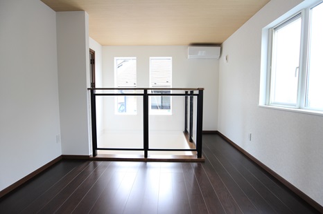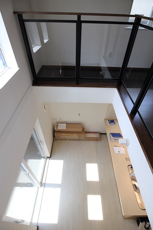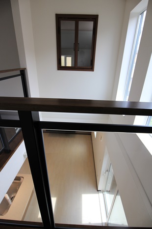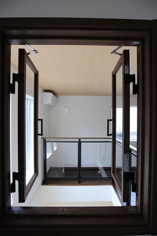 吹き抜け部から見えるように、素敵な室内用窓も設置致しました。