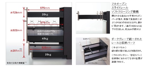 フロアユニットは、フルオープン、スライドレール、ソフトクロージング。
