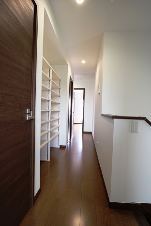 2階の廊下には、オープンスタイルの書棚が設けられています。