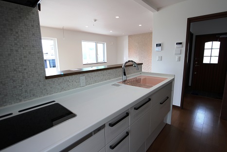 対面キッチンから望むリビングダイニングです。