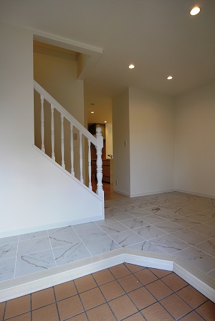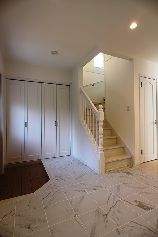 玄関ホールの床は、大理石模様のタイルで仕上げていて