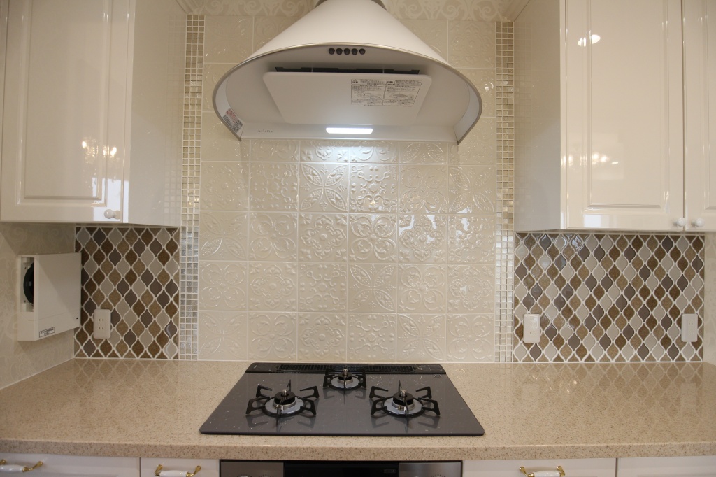 吊戸の下部部分にLIXILのミックスモザイクコロリートを使用しています。