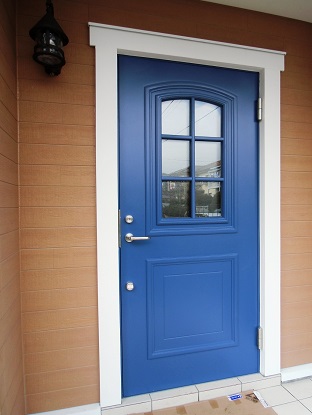 白色の窓・鳥居型の窓飾り、ブルーの玄関ドアが演出しています