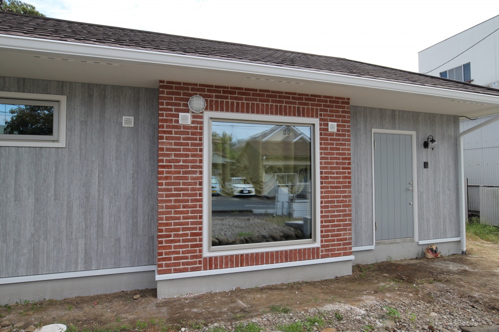 コンクリート調の外壁に正面からも目立つ大きな窓をレンガで囲むとてもおしゃれな外装です。