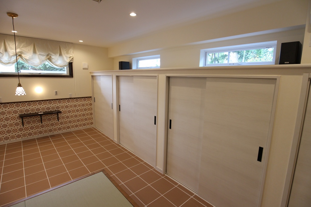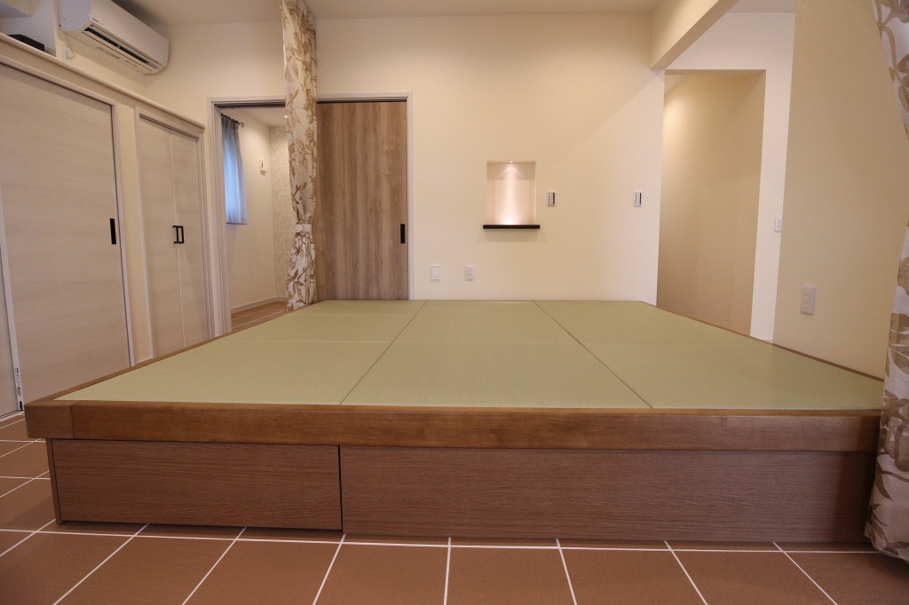床がタイルであってもお部屋の一角を和の空間に演出することができます。