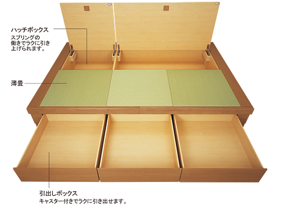 寛ぎのスペースとしてはもちろんのこと、畳の下は大容量収納庫となっており、