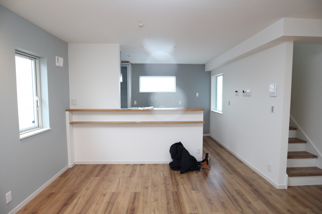 キッチン側の西面と、リビングの南面の二面にアクセントクロスとしてブルーグレーの壁紙を貼りました。