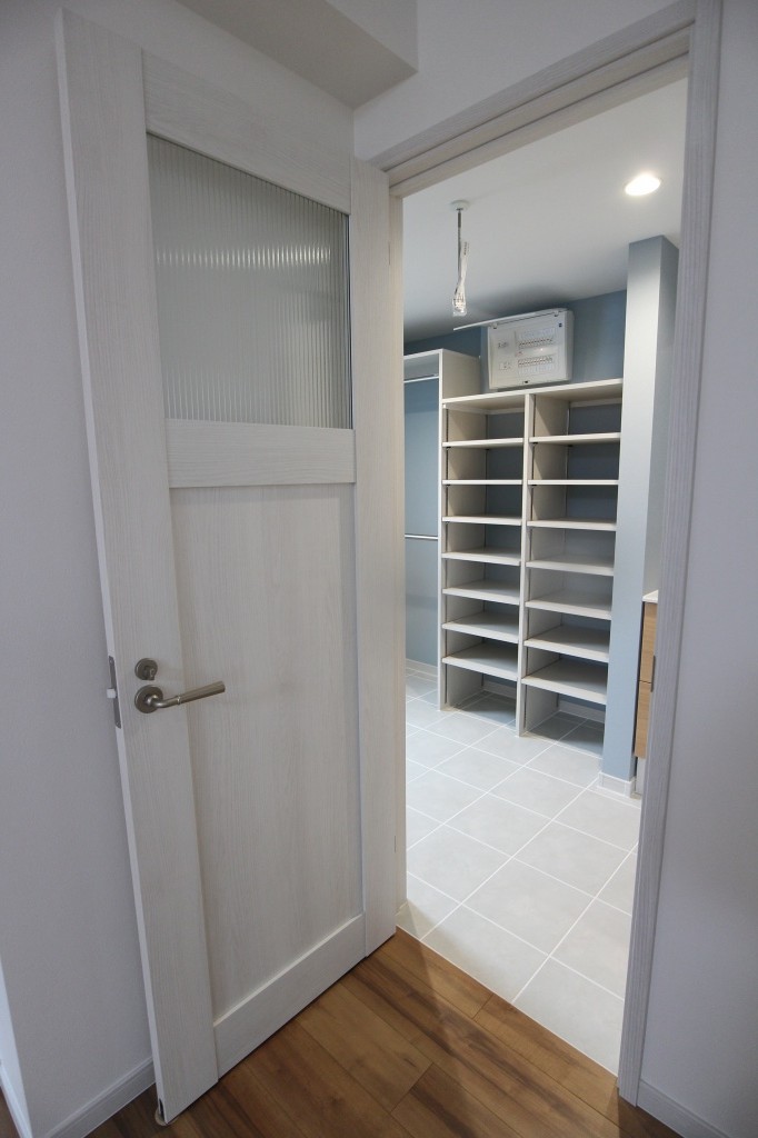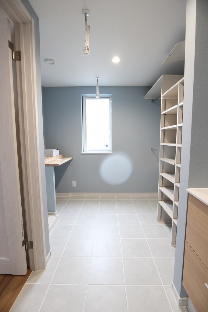 洗面台・洗濯機の他、家事を行う作業カウンターと、大容量収納棚を設けました。