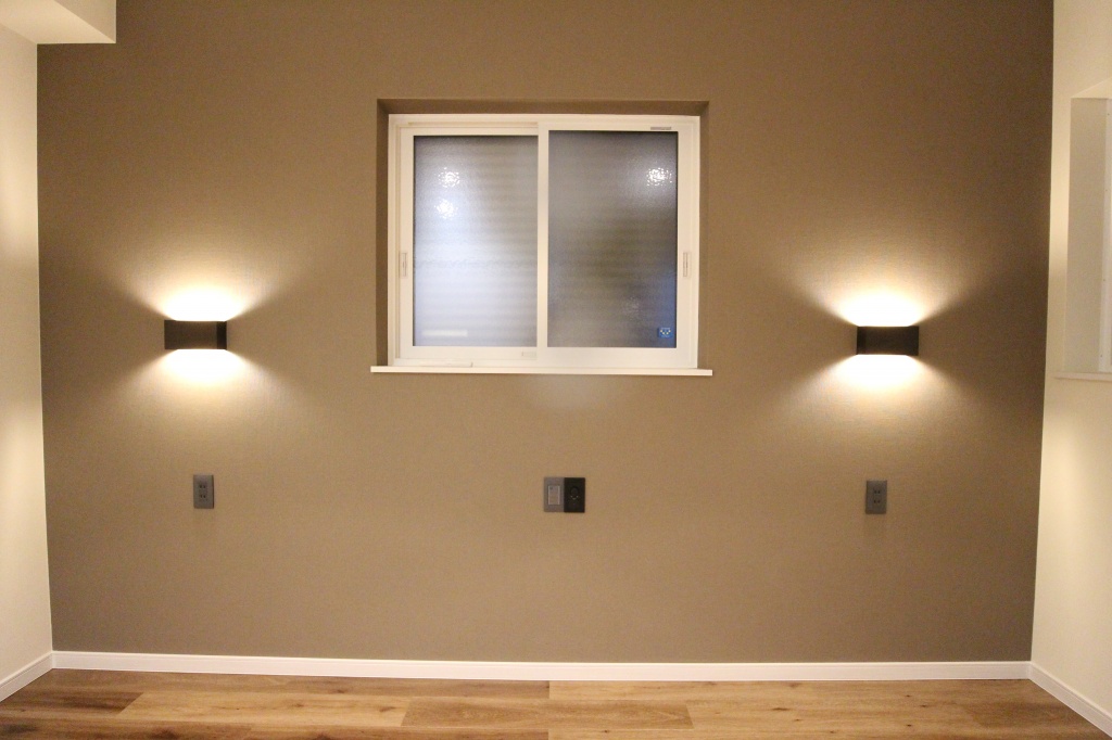 アクセントクロスとして一面(写真正面)に淡いブラウンのクロスを使用しました。