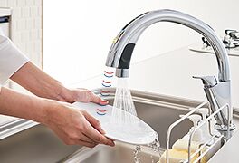 水栓にはタッチレス水栓を採用し、調理中の水栓操作が減らせて作業がスムーズに効率よく行えます。