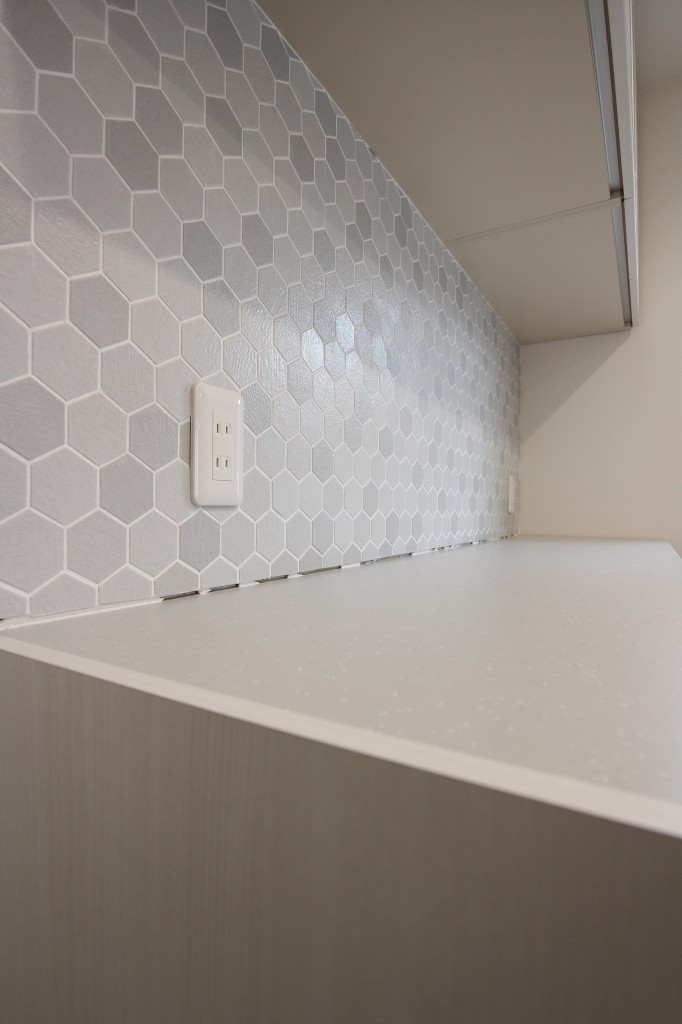 上部吊り戸棚との間にLIXIL製のヘキサゴンタイルを貼りました。