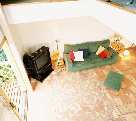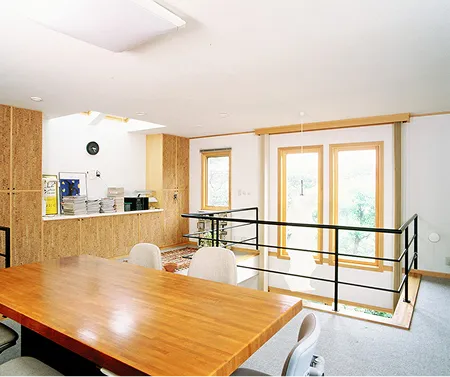 プライベートと仕事場を分けるために1階に寝室、2階をワンルームの広々としたLDKにし、3階に仕事場を設けました。南側が公営の緑地帯に隣接していたので、その絶好のロケイションを生かしてリビング部分に、3階へとつながる吹抜けを設け、疲れを癒してくれるゆったりとした空間にしました。また床にはメキシコ製のタイルを張ってテラス越しに望めるグリーンと一体感をもたせました。本来は1階部分にだけ蓄熱式床暖房「ウェルダン」を設置すれば家中を暖かくすることができますが、2階をLDKにしたことで寝室への音の問題を考えて、2階にも蓄熱式床暖房を設置しました。