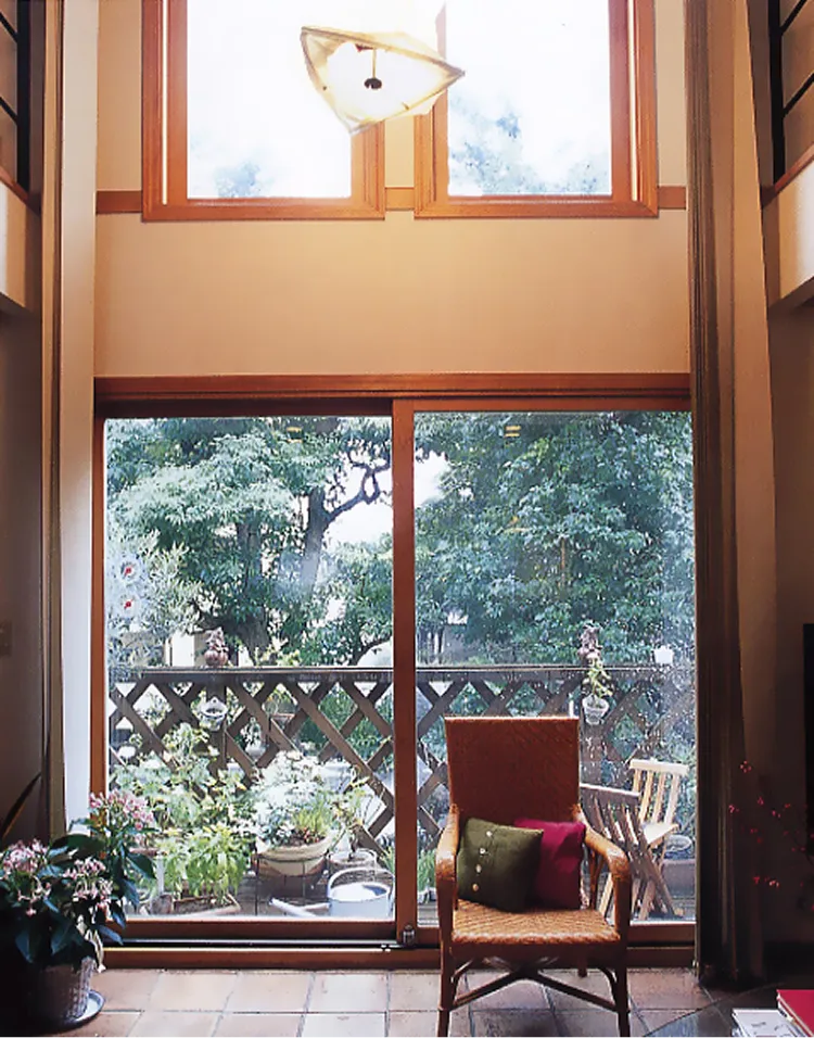 リビングにある大きな窓からは明るい自然光がさしこみます。通常大きな窓を設けるとそこから温かな空気が外に逃げてしまうそう。でもこの「ウェルダン」の家は、断熱効果の高いサッシを使用しているから大丈夫。この高性能サッシは、温かい空気を外に逃がさないだけでなく、冷たい外気をシャットアウトしてくれる優れもの。大きな窓の外には、季節を感じさせるサクラなどの木々を植えて、四季折々の自然を楽しんでいます。