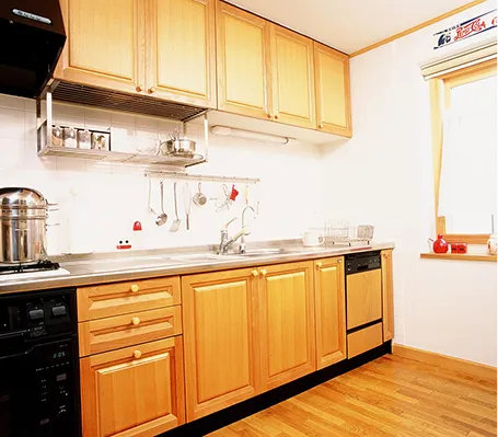 カウンターで仕切られたセミオープンキッチンは、初めて来たアシスタントにも使いやすいようにと考えて作りました。何がどこにあるかすぐに分かるように、収納棚を扉のないオープン棚にして、ガスレンジの脇には調理器具を吊り下げるレードルを取り付けました。また、地球に優しい生活を送りたいと思い、ソーラーシステムを導入。「ウェルダン」の高気密・高断熱住宅は省エネルギー住宅だから、毎日の生活に必要な電気をしっかり自給できます。日照時間の長い夏には、余った電力を電力会社に買ってもらうこともあるんですよ。