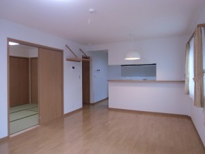 LDKのキッチンは対面式にして広く使い勝手が良さそうです リビング横のタタミルームは段差がないバリアフリーで、 しかもウェルダンの家は1階全室床暖房ですので 勿論、畳が敷いてあっても床暖房の暖かな畳になります