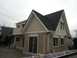外観は1階がレンガ調・2階がアイボリーのツートン、 スウェーデンドアに見事な大屋根で可愛らしいけど迫力ある外観になりました 幹線道路沿いの立地で、かなり目立つ外観で、お施主様も 「目立ってこまっちゃうなぁ」といいつつ、とっても嬉しそうでした