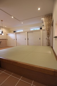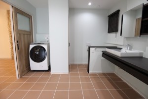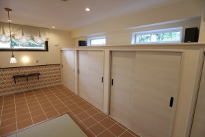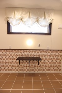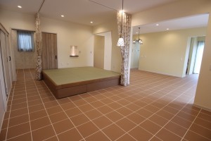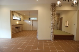 室内の床は全てタイル仕上げとなっており、靴を脱がないスタイルとなっています。この背景には、施主様の愛犬に対する強い想いがあったんです。ワンちゃんを飼っていらっしゃる方で、「フローリングだと犬が滑って歩きづらそうだな」と心配されている方も多いのではないのでしょうか。専用のカーペットを敷いたり、いろいろ対策をされている方もいらっしゃると思いますが実は床をタイル貼りにするという方法があるんです。タイルだと掃除もしやすい上、滑りにくい材質のためワンちゃんを飼っている環境では最適な床材となっています。大切なペットを最優先に考えてこだわったお家作り、すごく素敵ですよね!是非、大切なペットの為に一度考えてみてはいかがでしょうか。こちらのお施主様は土地の選定から当社で担当させて頂きました。土地の選定でお困りの方がいらっしゃいましたら、お気軽に当社までお声掛け下さい。